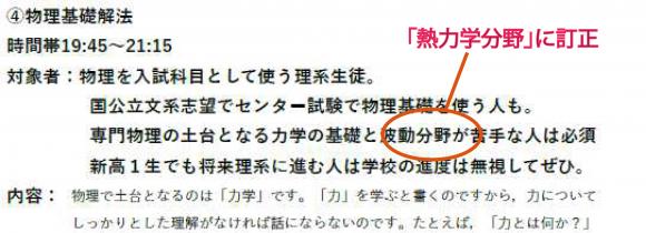 昨日アップした高校土曜講座で訂正です。 物理基礎解法の対象者で, 「波動分野が苦手な人」とありましたが, カリキュラム表に波動がありません! すみません。 高1の進度を考えたら熱力学を先にやります。 したがって,波動分野が苦手な人でなく,熱力学分野が苦手な人を対象とします。