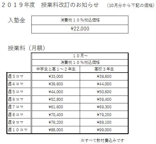いよいよ10月から消費税が10%になります。 当塾でも、10月分の授業料から下表のように料金が変わりますので、ご入金の際によくご確認ください。 クリックで大きくなります。 PDFはこちら ↓ 10月からの料金表