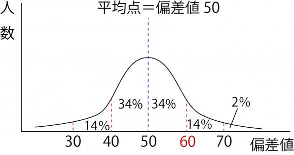 正規分布というのは,数学的に決められた分布で,それによると偏差値60と50の間には全体の34%の人数が含まれます。