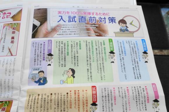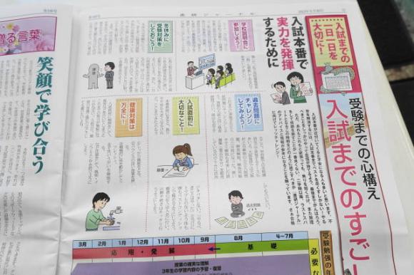 受験生の中学3年生には進研ジャーナル秋冬号を配布しています。 入試に向けてのいろいろな記事が載っています。 あたりまえのことですが,年内にほぼ私立の受験校を決め,冬休みに頑張って学力アップをしましょう。 受験校については各自相談に来てください。 そして,直前期までの心構えも書いてあります。 健康対策とか書いてありますが,体調を整えられないようだと勉強もはかどりません。 入試当日に熱とか出さないようにしましょう。 とはいえ,病気やケガは気をつけていてもする時はしますから,その時はあきらめるというのが正しい対処法です。 にほんブログ村 にほんブログ村