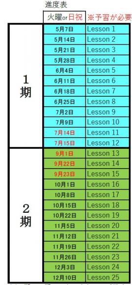 夏期講習前の1期12講と夏期講習後の2期13講に大きく分けます。