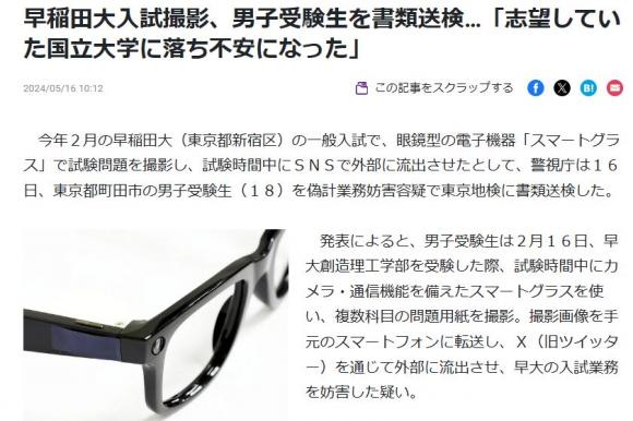 どうやら,スマートグラスと呼ばれるメガネで入試問題を撮影し,外部の人に解答してもらっていたようです。