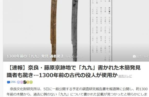 なんと1300年も前の九九の表が見つかったようですね。 当時の役人は計算するときに暗記はしていなかったのでしょう。 それで早見表を使っていたと推測されます。 現代の日本人はすごいですよ。 九九を暗記しているのですから。 これは諸外国を見てもかなり特殊なようです。 ただ,インド人は20の段まで覚えるといいます。 見習いたいものです。 実際のところ,中学生になったら11×11=121,12×12=144などの平方数は覚えておくべきです。 因数分解などで使いますからね。 17×17=289とか,大丈夫ですか? ちなみに,21×21や25×25も覚えておくと便利ですよ。 にほんブログ村 にほんブログ村