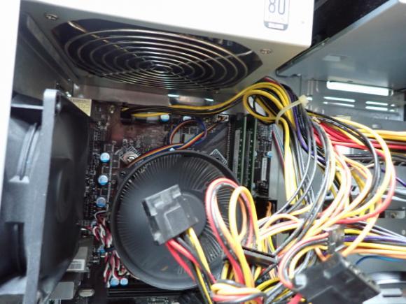 ケースを開けて,エアダスターを吹きかけてみると,電源ファンの異音とわかった。