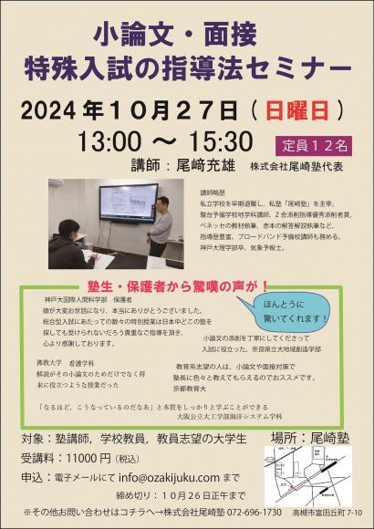 今回は,大学入試の小論文・面接や総合型推薦で課されるような特殊入試の指導法セミナーです。