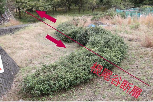 これは,もともと田畑の境界に植えてあった茶の列が濃尾地震で7mずれてしまいました。
