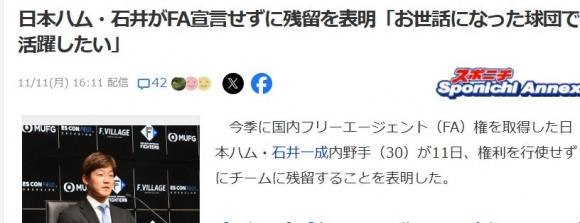 石井選手は宣言せずに,お世話になった日ハムで頑張る。