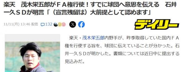 茂木選手は,FA宣言して残留するのもアリだが,他の球団の評価を聞いてみたい模様。