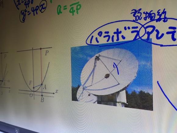 さらに,数学的な性質を用いて実生活に役立っている例として,パラボラアンテナや,高速道路の曲線の形状の話もしました。