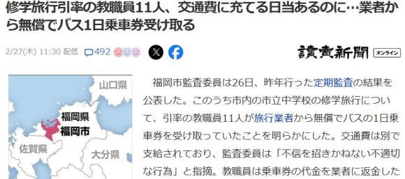 修学旅行先の京都で,教職員が業者から1日パスをもらってて,交通費を浮かしてたという話。