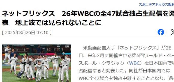 前回,国民的に盛り上がったWBC( World Baseball Classic )が,次回は地上波で見られないとか。 もう,あのような盛り上がりにはなりませんね。 なんやかんや,日本ではまだ地上波で扱われるかどうかが重要です。 家のテレビに映らないものは話題にはなりにくい。 ネットで視聴する若者が増えているとはいえ,日本での野球人気には大打撃です。 サッカーではJリーグをDAZNが独占して,地上波で見られなくなりました。 プロ野球もほぼ地上波でやらなくなったし,テレビはすでにオワコンなのでしょう。 にほんブログ村 にほんブログ村
