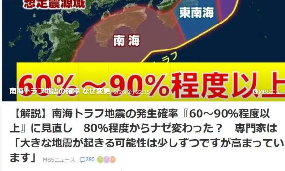 南海トラフを震源とする大地震はいつ起きてもおかしくないのですが,その発生確率に修正がされました。 今後30年間に発生する確率が60〜90%ということです。 まあまあ高いですね。 ですが,大阪府民はそんなに恐れる必要はありません。 特にウチの塾らへんまでは津波も来ないでしょうし,震度も5とかでしょう。 以前の高槻地震で家にヒビが入ったのと同じ程度? 和歌山や高知に住んでる人は,海岸にいると津波がすぐに来るので大ピンチです。 ダッシュしましょう。 ちなみに,ウチの塾的には発生予想が2038年です。 もしも2038年に起こったときは「そういえば,あの塾がそう予想していたなあ」と思い出していただけたら幸いです。 その頃にはもう塾は廃業してるかなあ? 授業中に地震が来ないように,2037年に廃業しましょうかね。 にほんブログ村 にほんブログ村