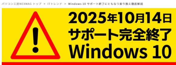 マイクロソフト社のOSのウインドウズ10がこの10月にサポート終了になるようです。