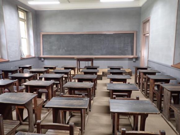 黒板が前にあって,1クラス30〜40人ぐらいで授業を受ける。