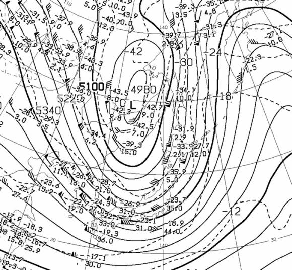 寒くなりましたねー 500hPa面の寒気の図を貼っておきますね。 やっぱりマイナス42℃以下の寒気があります。 そりゃ寒いわ。 冬将軍ですね。 寒いなーと思ったら,つい500hPa面の天気図を見てなんとなく納得してしまう今日このごろです。 にほんブログ村 にほんブログ村