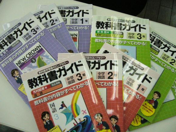 教科書ガイドって1冊2000円くらいする。 高価なので持ってない人も多いでしょう。 塾に英,国,理の分を買いましたので自習用に利用して下さい。 もちろん自習中に質問してくれてもOKです。
