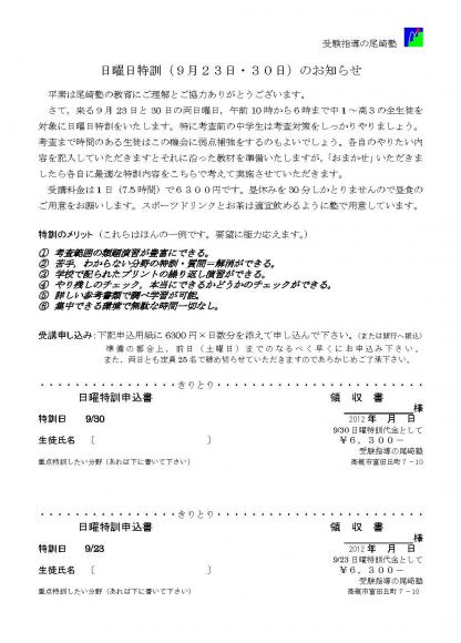 主に中学3年生の内申点確保のために,考査直前の日曜日に特訓を実施しています。